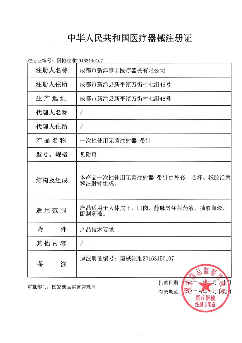 产品名称:一次性使用无菌注射器(带针)